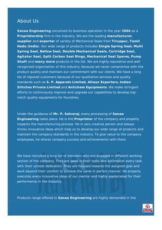 Senaa Engineering, established in 2004, is a leading manufacturer and supplier of various mechanical seals based in Tiruppur, Tamil Nadu, India. The company offers a wide range of products including spring seals, cartridge seals, and mechanical seal spares, recognized for their durability and quality. Under the guidance of owner P. Selvaraj, Senaa Engineering emphasizes innovative ideas and has established a strong reputation in both domestic and international markets.