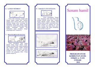 Dokumen tersebut memberikan informasi tentang 8 jenis senam hamil yang dapat dilakukan untuk menjaga kesehatan ibu hamil dan janin, yaitu: 1) duduk bersila dengan gerakan pemanasan kepala dan bahu; 2) memutar lengan sambil mengangkat payudara; 3) relaksasi otot; 4) gerakan kaki seperti mengayuh sepeda; 5) mengangkat panggul; 6) melatih otot perut; 7) melenturkan pungg