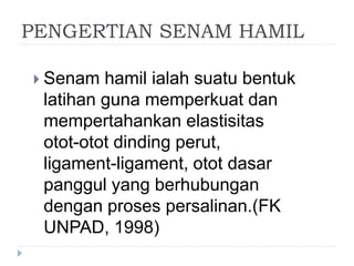 Dokumen tersebut membahas tentang senam hamil, yang merupakan latihan untuk memperkuat otot-otot yang terkait dengan proses persalinan. Manfaat senam hamil antara lain melatih teknik pernafasan, memperkuat kelenturan otot perut, dan melancarkan proses persalinan. Dokumen tersebut juga menjelaskan contoh gerakan dasar senam hamil seperti duduk bersila, merangkak, dan berbaring miring.