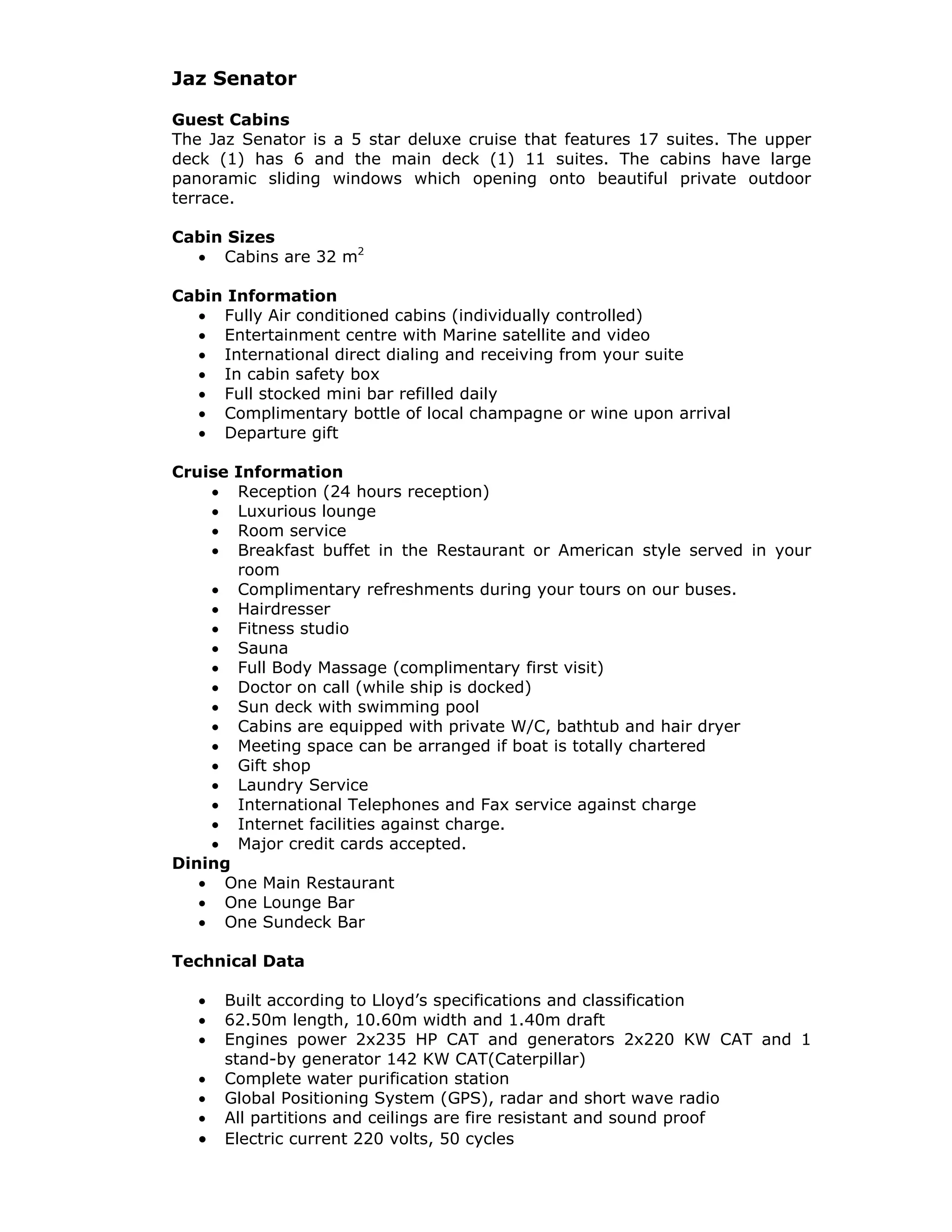 The Jaz Senator is a 5-star deluxe cruise ship with 17 suites across its upper and main decks. The suites have large windows opening onto private outdoor terraces. Cabins are 32 square meters and include amenities like air conditioning, mini bars, and complimentary champagne. The cruise offers amenities such as 24-hour reception, restaurants, lounges, spa services, and water activities. The ship was built to Lloyd's specifications and has safety and navigation features.