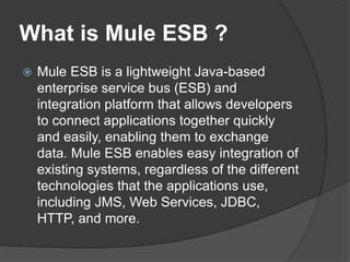 Mule ESB is a lightweight Java-based integration platform that allows developers to connect applications together quickly and easily. It enables integration regardless of application technologies. The document provides an example of using Mule ESB to send an email attachment by reading a file from a source directory using the SMTP connector and attachment transformer. It describes the prerequisites and provides the full XML configuration for the flow.