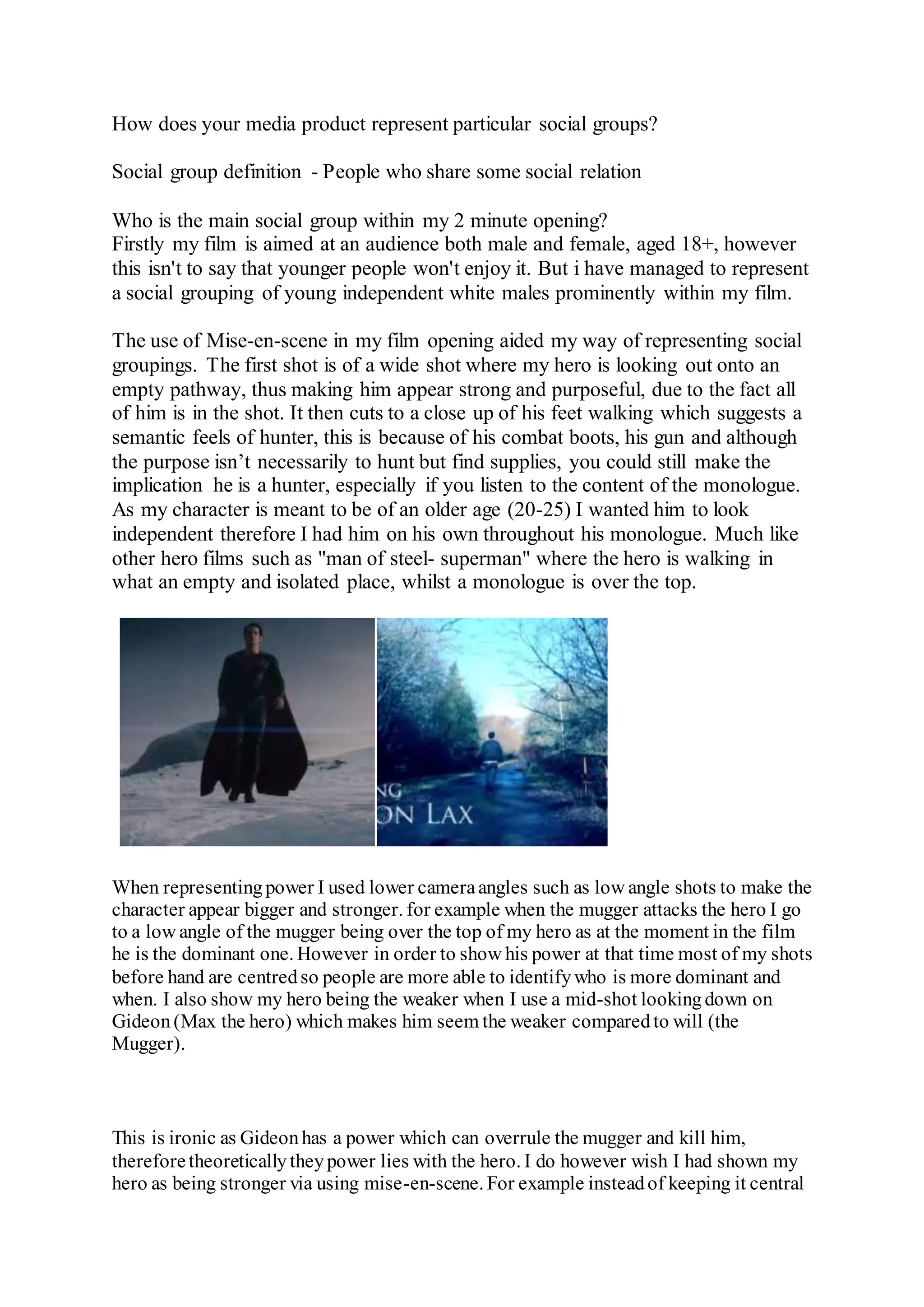 The document discusses how a 2-minute film opening represents certain social groups through mise-en-scene and camera work. Specifically, it prominently features a social group of independent young white males. Scenes of the main character alone establish him as independent, and combat boots, a gun, and hunting imply he is a hunter. Camera angles are used to represent power, with low angles making characters appear stronger and central shots showing who is dominant. Violence and complex dialogue require an older target audience of 18+. Costumes match modern styles to be set in the present or near future.