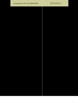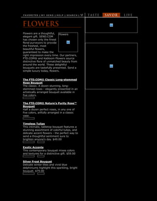 This document discusses flower bouquets available from Send.com. Send.com partners with FTD.com and Kabloom Flowers to source the freshest flowers from around the world. Several bouquet options are described, including a dozen long-stemmed roses in various colors, half a dozen roses artfully arranged in a classic vase, a bouquet of colorful tulips and accent flowers for $49, a contemporary mixed bouquet for $59, and a winter bouquet featuring lilies and delphiniums for $79.