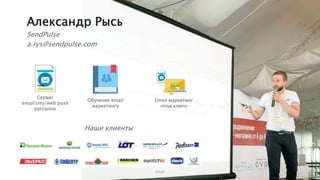 Документ касается услуг интернет-маркетинга, предоставляемых компанией SendPulse, включая email, SMS и web push рассылки. В нем обсуждаются методы сегментации базы контактов, возможные интеграции и шаблоны для рассылок, а также советы по повышению открываемости писем. Также упоминаются ошибки в email маркетинге и важность получения согласия на рассылку для поддержания хорошей репутации и высокой конверсии.