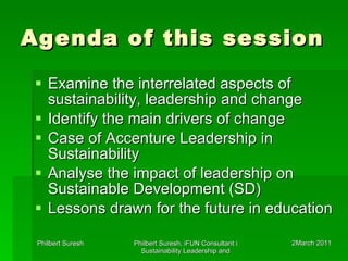 This document discusses sustainability, leadership, and change. It examines drivers of sustainability like consumer demand, stakeholder influence, and resource depletion. It uses Accenture as a case study, highlighting how the company has embedded sustainability into its culture and identified six key drivers. The document outlines challenges of managing a multigenerational workforce and need for strategic and holistic approaches to sustainability for the 21st century.