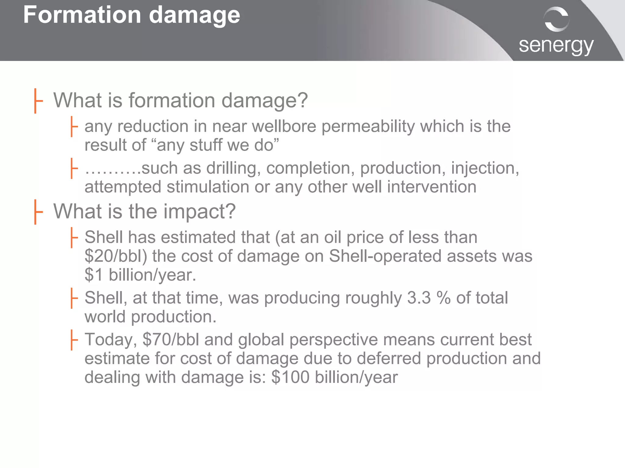 The document discusses formation damage in oil and gas wells, highlighting its impact on production costs, estimated to be $100 billion annually at current oil prices. It emphasizes the importance of evaluating and mitigating formation damage during well planning and drilling operations, using two case studies to illustrate how improved understanding and management of formation properties can unlock reservoir potential. By employing integrated studies and innovative drilling practices, operators can enhance well productivity and reduce economic losses due to formation damage.