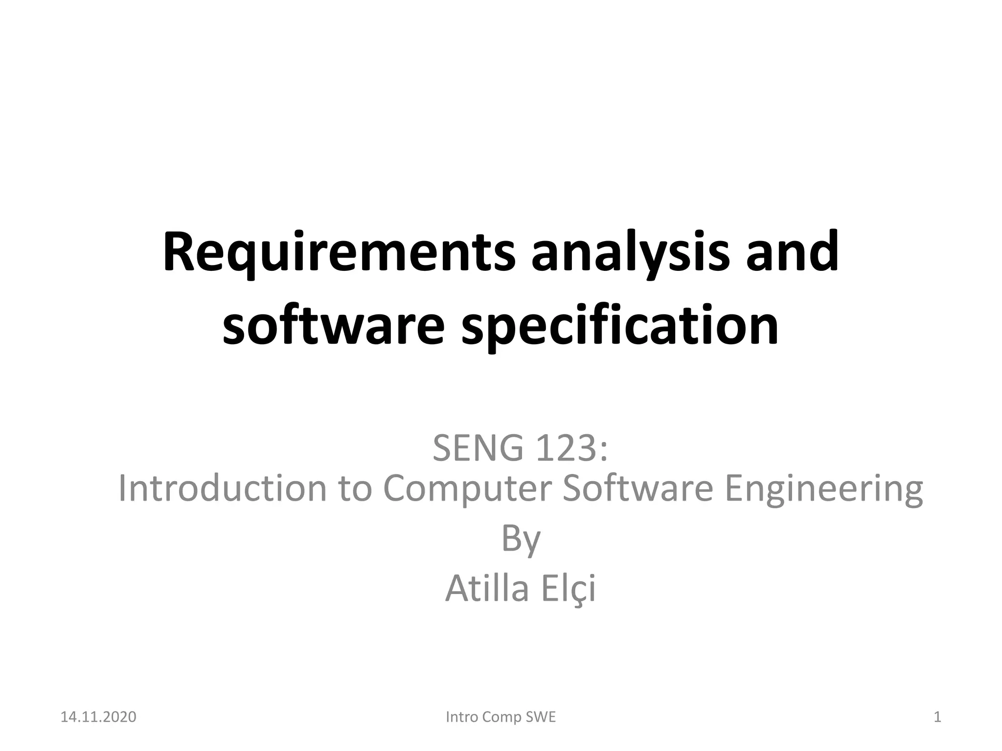 This document discusses requirements analysis and software specification. It covers eliciting requirements through interviews, focus groups, and questionnaires. Requirements are then analyzed, recorded, and documented in a Software Requirements Specification (SRS). The SRS is a complete description of the target system's functional and non-functional requirements. Joint Application Development, Group Support Systems, and Computer-Aided Software Engineering are modern methods used for requirements analysis. Requirements documentation serves many purposes for all roles involved in software production.
