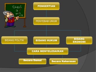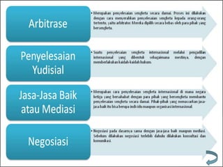 Dokumen ini membahas sengketa internasional, penyebab, dan cara penyelesaiannya melalui metode damai dan kekerasan. Penyebab umum sengketa mencakup kesalahpahaman, pelanggaran hukum, dan klaim teritorial antara negara. Penyelesaian dapat dilakukan melalui peradilan internasional seperti Mahkamah Internasional atau melibatkan upaya diplomatik seperti negosiasi dan konsiliasi.