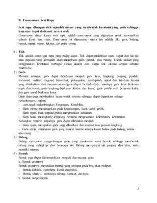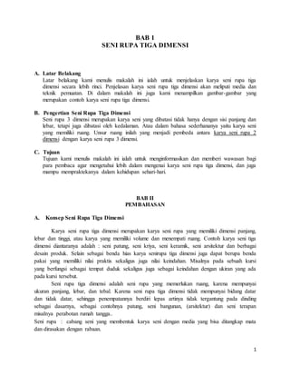 Makalah ini membahas seni rupa tiga dimensi, termasuk definisi, jenis, unsur, teknik, dan prinsipnya. Jenis seni rupa 3D dibedakan menjadi karya murni untuk ekspresi dan karya terapan untuk kegunaan, seperti patung, keramik, dan perabotan. Unsur-unsurnya meliputi titik, garis, bidang, bentuk, ruang, warna, dan tekstur. Teknik pembuatannya antara lain pa