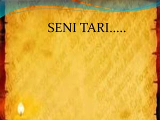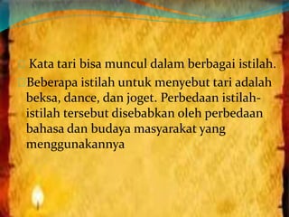 Dokumen tersebut membahas tentang seni tari di Indonesia, mulai dari definisi tari menurut para ahli, sejarah perkembangan tari di Indonesia dari zaman prasejarah hingga masa kini, jenis-jenis tari tradisional dan modern, unsur-unsur penting dalam tari seperti gerakan, musik, kostum, serta fungsi dan peranan tari dalam upacara adat dan agama maupun sebagai hiburan.