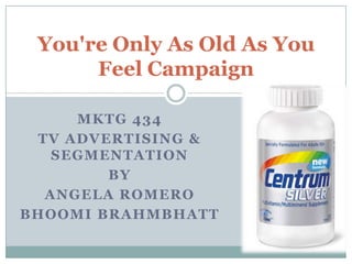 This document discusses a marketing campaign targeting seniors aged 65 and older. It analyzes the demographic, psychographic, and geographic characteristics of seniors. The campaign aims to position the message that you are only as old as you feel by showing seniors engaged in active lifestyles. TV advertisements will run on networks like CBS Local News and The Ellen DeGeneres Show to reach both female and male seniors. The ads will feature doctors discussing health issues and solutions like Centrum vitamins, along with videos of seniors enjoying hobbies and activities.