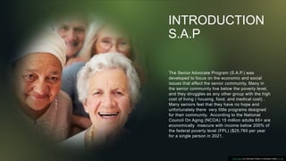 The document describes the Senior Advocate Program (SAP) which was created to address the economic and social issues facing seniors. Many seniors live in poverty and struggle with high costs of living. SAP will focus on outreach in the community, providing assistance with issues like housing, food, and medical costs. The organization will be led by a Director and include Program Managers, Resolution Specialists, and Outreach Workers to connect seniors to resources. A proposed annual budget of $300,000 is outlined.