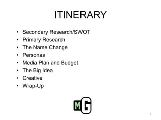The document outlines a media plan to rebrand Don Rosen Imports as Pleasant Valley Imports. It includes secondary research on the target demographics, a SWOT analysis, primary customer research, and the development of personas. The media plan proposes a budget allocation across various channels including radio, online, social media, billboards, and PR to increase brand awareness and drive new and existing customers to the dealership. The overarching idea is to target two key demographics and communicate that the dealership is "Driven By You".