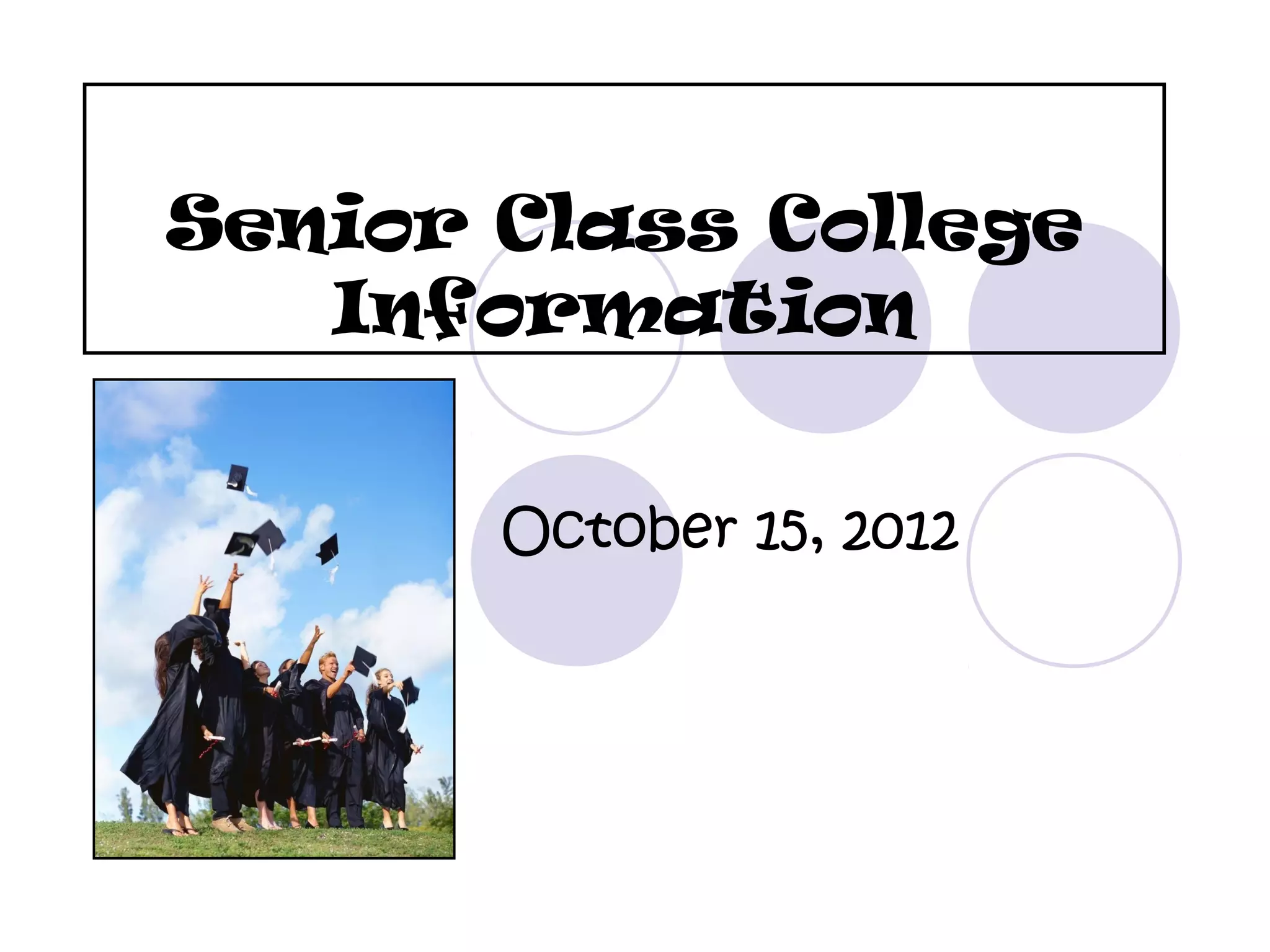 This document provides information for seniors about college admissions requirements and processes. It discusses the differences between UC and CSU admissions, options for community college or private institutions, upcoming application workshops, testing deadlines, and useful websites. Cost estimates are given for CSU tuition and living expenses. Statistics on admissions for SDSU and SJSU are also included. The document stresses continuing academic rigor through the senior year and not letting grades slip due to "senioritis".
