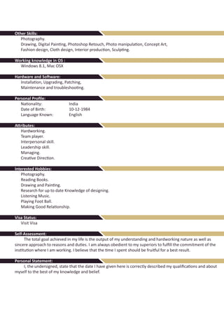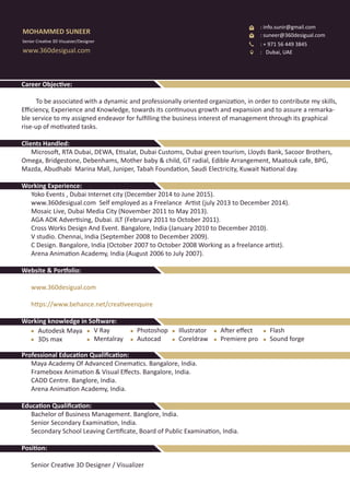 The document is a detailed CV of Mohammed Suneer, a senior creative 3D designer and visualizer based in Dubai, with extensive experience working with notable clients like Microsoft and Dubai Customs. He holds a bachelor's degree in business management and has qualifications from various animation and design academies in India. Suneer possesses a diverse skill set in software and artistic disciplines, and emphasizes his commitment to teamwork, creativity, and continuous learning.