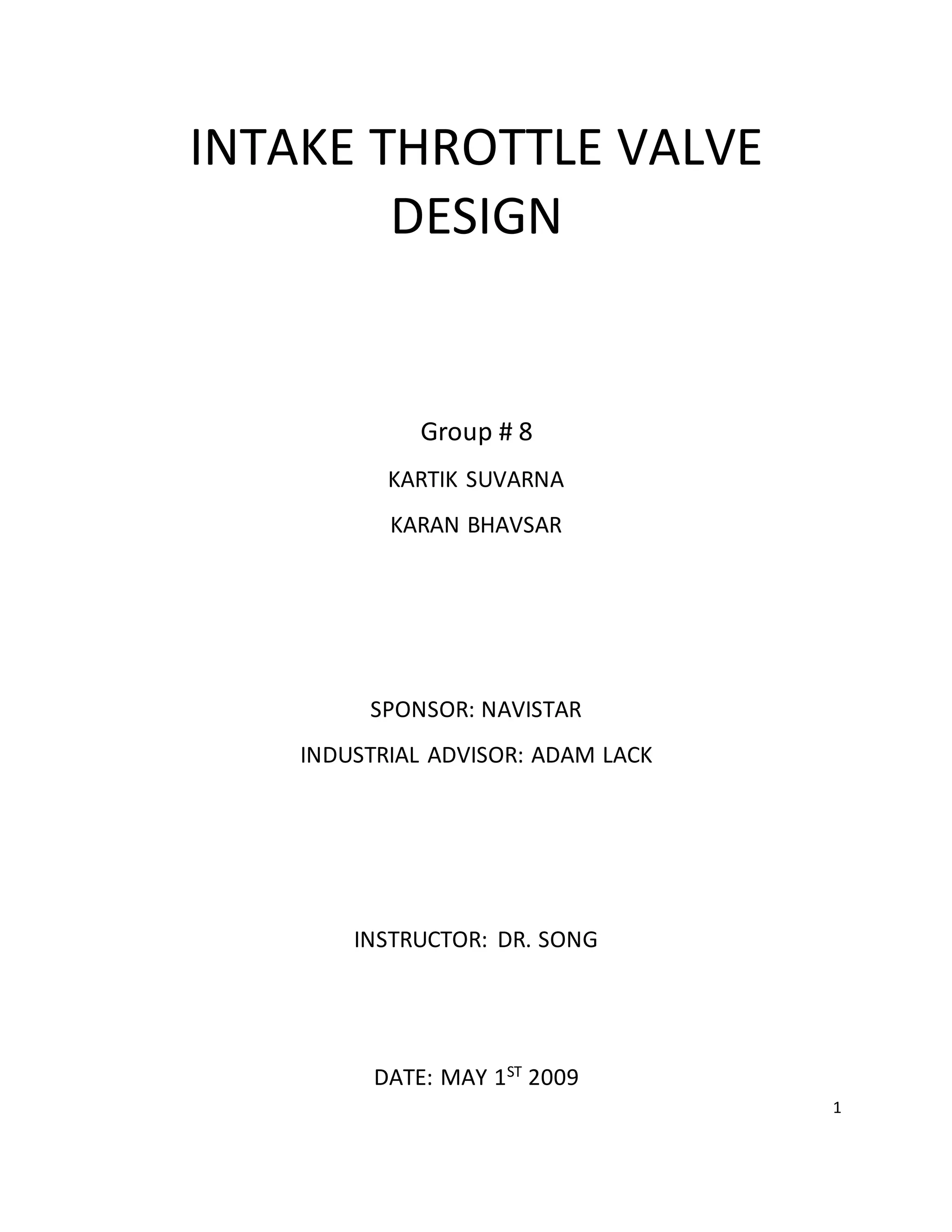This document outlines the design of an intake throttle valve for a Navistar engine. It discusses the current issues with rapid closure of the throttle valve due to increasing pressure differential. Three concepts are proposed to address this - an orifice plate valve with a hole, an oval shaped valve, and a reduced diameter valve. Calculations of fluid flow and pressure differential would be used to select the best concept to prevent forced closure while meeting performance targets. Testing of a prototype part would then validate the chosen design.