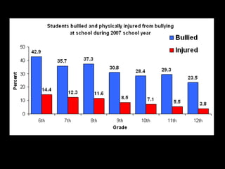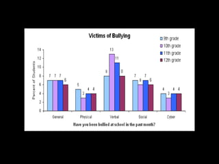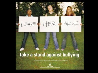 This document discusses bullying and harassment in schools. It defines bullying, examines reasons why people bully, and describes different types of bullying like physical, emotional, cyber, and text bullying. It also explores the link between bullying and suicide, providing examples of students who took their lives after enduring prolonged bullying. The document advocates for government action to address bullying and notes several bills and laws aimed at preventing bullying and harassment.