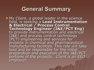 This job posting is seeking a Senior Instrumentation & Electrical Engineer to lead instrumentation and electrical (I&E) and process control technology (PCT) engineering projects for chemical and pharmaceutical manufacturing facilities. Responsibilities include developing specifications, leading project teams, reviewing documentation, and providing field support. Requirements include a BS in engineering, 6+ years of relevant experience, professional engineering license, and knowledge of control systems, codes, and software. The company offers competitive benefits and is located in Baytown, Texas, which has a mild climate and outdoor recreational activities.