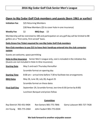 The 2016 Big Cedar Golf Club Senior Men's League is open to members and guests born in 1961 or earlier. The initiation fee is $25 for returning members and $30 for new members, which includes $5 for hole-in-one insurance. The weekly fee is $2 and BBQ days are $3. Membership is limited to 100 golfers per day on a first come, first served basis. Non-members pay $15 to have their handicap entered. Guests are welcome if space allows. The league starts on May 5 and runs each Thursday with a scramble format on opening day and four BBQ dates. It concludes on September 29 with a scramble, luncheon, and prizes.