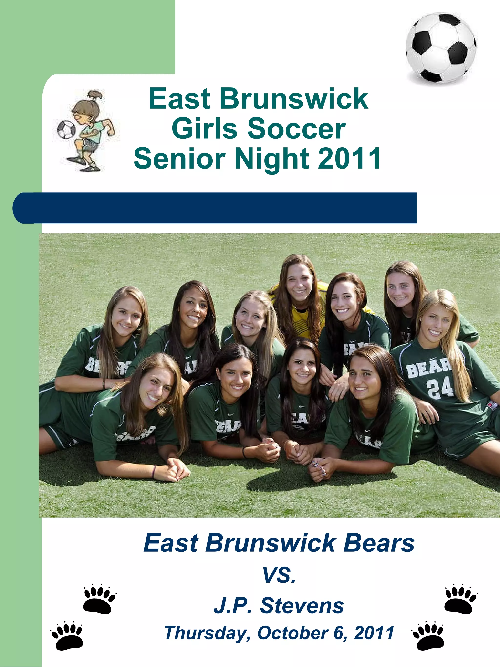 The document summarizes the East Brunswick Girls Soccer Senior Night event held on October 6, 2011. It lists the names of the varsity seniors on the East Brunswick Bears soccer team, along with some of their accomplishments and thoughts on their soccer career and time with the East Brunswick team. It also recognizes the junior, sophomore, and freshman members of the East Brunswick Bears soccer team.