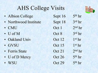 This document provides guidance and timelines for Algonac High School seniors regarding their post-secondary education planning. It outlines details about college applications, financial aid, scholarships, ACT/SAT testing, and timelines for specific tasks throughout their senior year. Students are expected to have a post-secondary plan on file with their guidance counselor prior to graduation.
