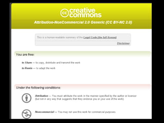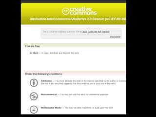 The document provides tips and guidelines for using images from copyright friendly sources like Creative Commons in school projects. It explains how to find images on sites like Flickr and Wikimedia Commons that have Creative Commons licenses. The licenses are described, including what types of uses they allow. Students are instructed to always provide image attribution and to pay attention to license details regarding altering or using images for commercial purposes. Examples are given for how to attribute images from different sources in slides and documents.