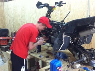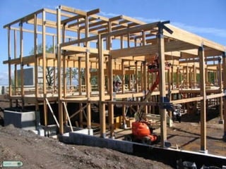 The document describes the process of designing and building a lift system for powersports vehicles. It shows drawings and photos of each step, from initial designs in AutoCAD to laying out the base, assembling the frame, adding wheels and jacks, and finishing with a test run lifting a four-wheeler. The final sentences note the importance of patience throughout the project.