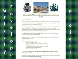 This document outlines a senior breakfast project where students provided breakfast foods and donations for seniors. It lists the need for the project, how it was advertised, the foods provided, the facilitator, and thanks given to various groups including sponsors, volunteers, the school, and facilitators for their roles in making the senior breakfast a success.
