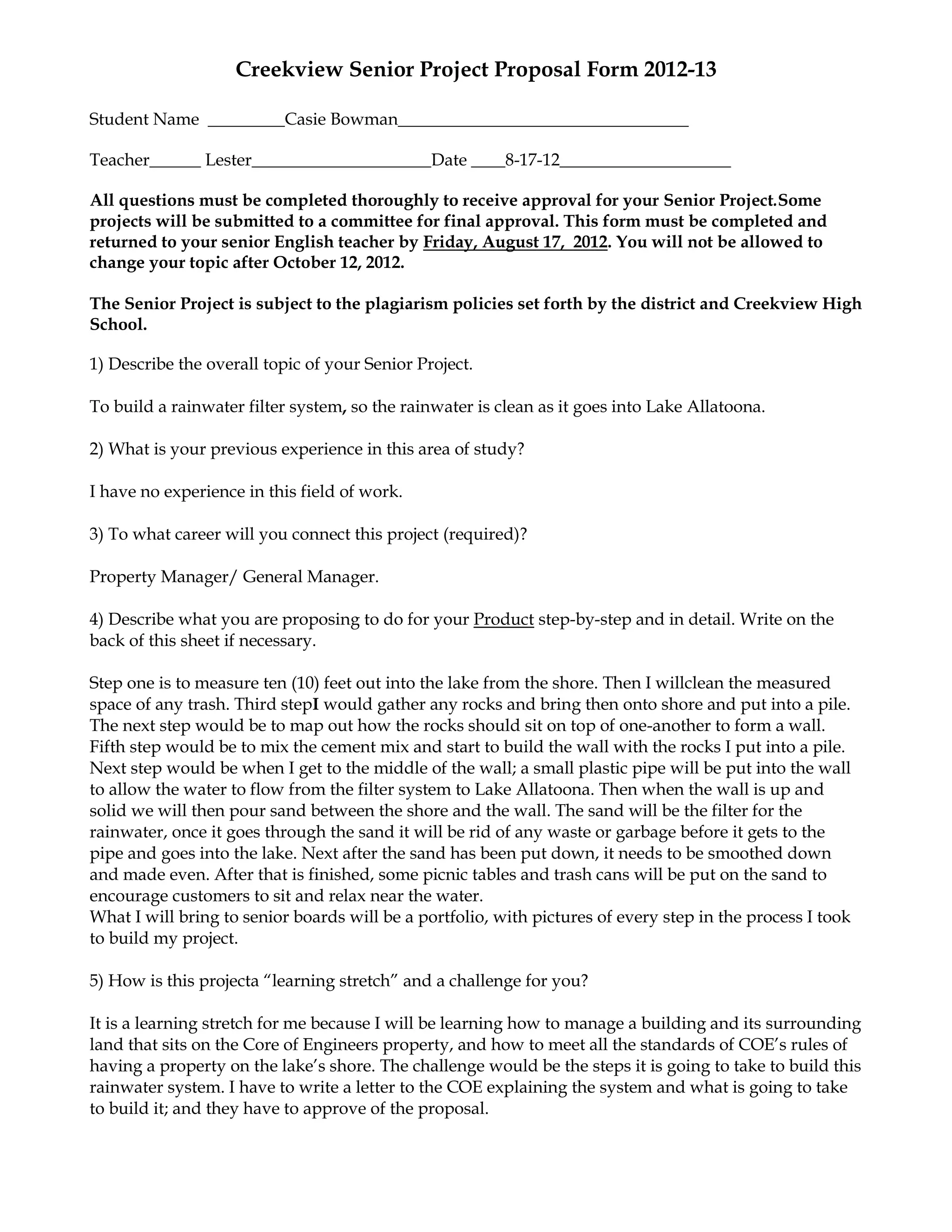 Casie Bowman proposes to build a rainwater filter system along Lake Allatoona's shore to clean rainwater before it enters the lake. The project involves measuring the shoreline, clearing trash, arranging rocks to form a wall, mixing cement to build the wall with a pipe for water flow, filling the area with filtering sand, and adding picnic tables. This challenges Casie to learn land and property management standards for Corps of Engineers property. The estimated $200-300 cost will be funded by donations at an upcoming event, with Casie providing remaining money saved from work. Casie's project facilitator will be Ira Smith, the property manager at a nearby marina experienced in Corps of Engineers regulations.