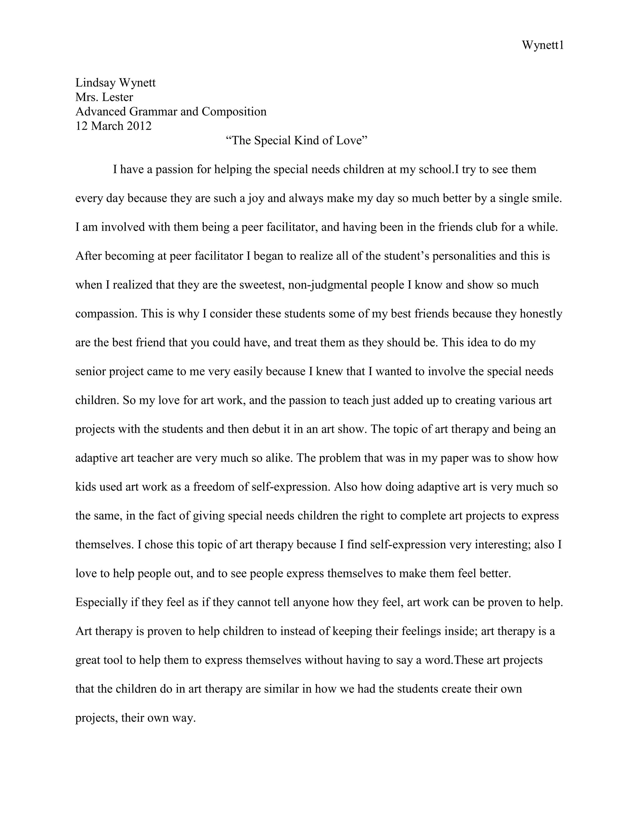 Lindsay Wynett completed an art show as her senior project to showcase art projects created by special needs students at her school. She worked with an adaptive art teacher, Mrs. Murphy, to plan and facilitate four different art projects for the students to work on over several months. The projects included mosaics, paintings using warm and cool colors, ceramics, and crayon scrapings. Wynett then organized and mounted an art show of the students' works at the Cherokee Art Center. The show was well-attended and an article about it was published in the local paper. Through this project, Wynett learned more about teaching art to special needs students and gained skills in project planning,