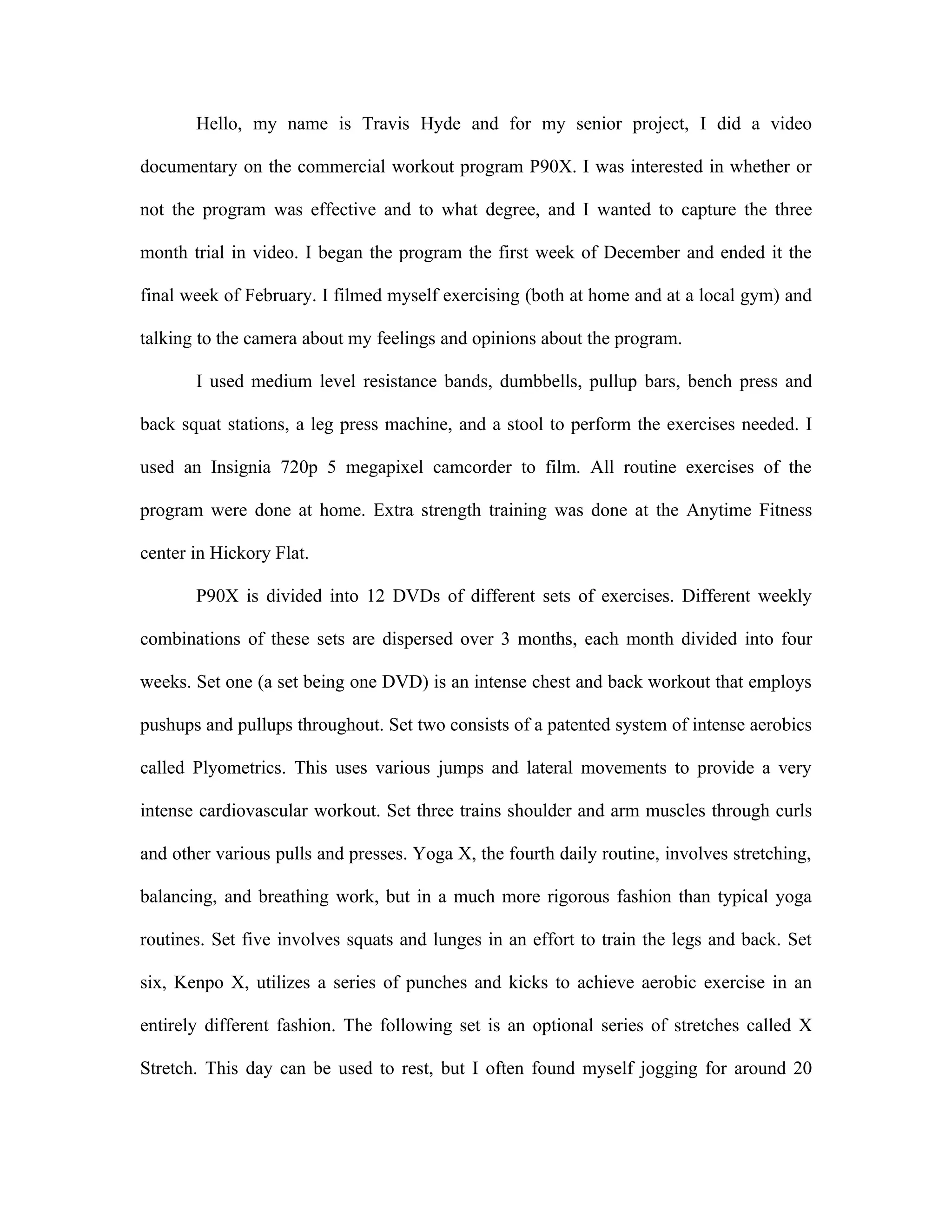 Travis Hyde created a video documentary of his experience with the P90X workout program over 3 months. The program involves 12 DVDs with different exercise routines that target specific muscle groups. Travis found the program effective but too basic for an experienced athlete. During the first week, Travis injured his lower back while squatting and had to modify his leg exercises. Overall, Travis felt the program was well-organized but not necessary for someone already knowledgeable about different exercise types.