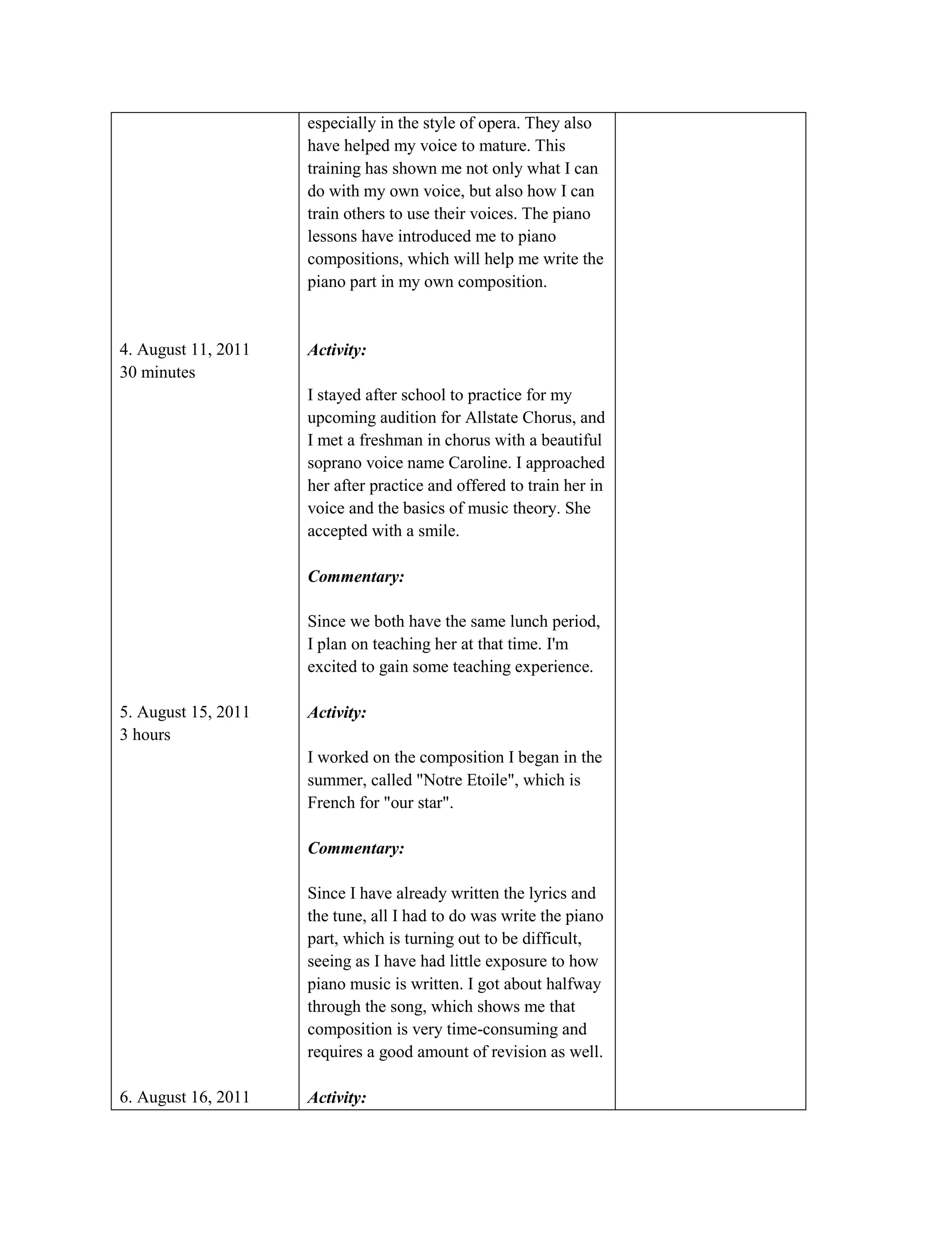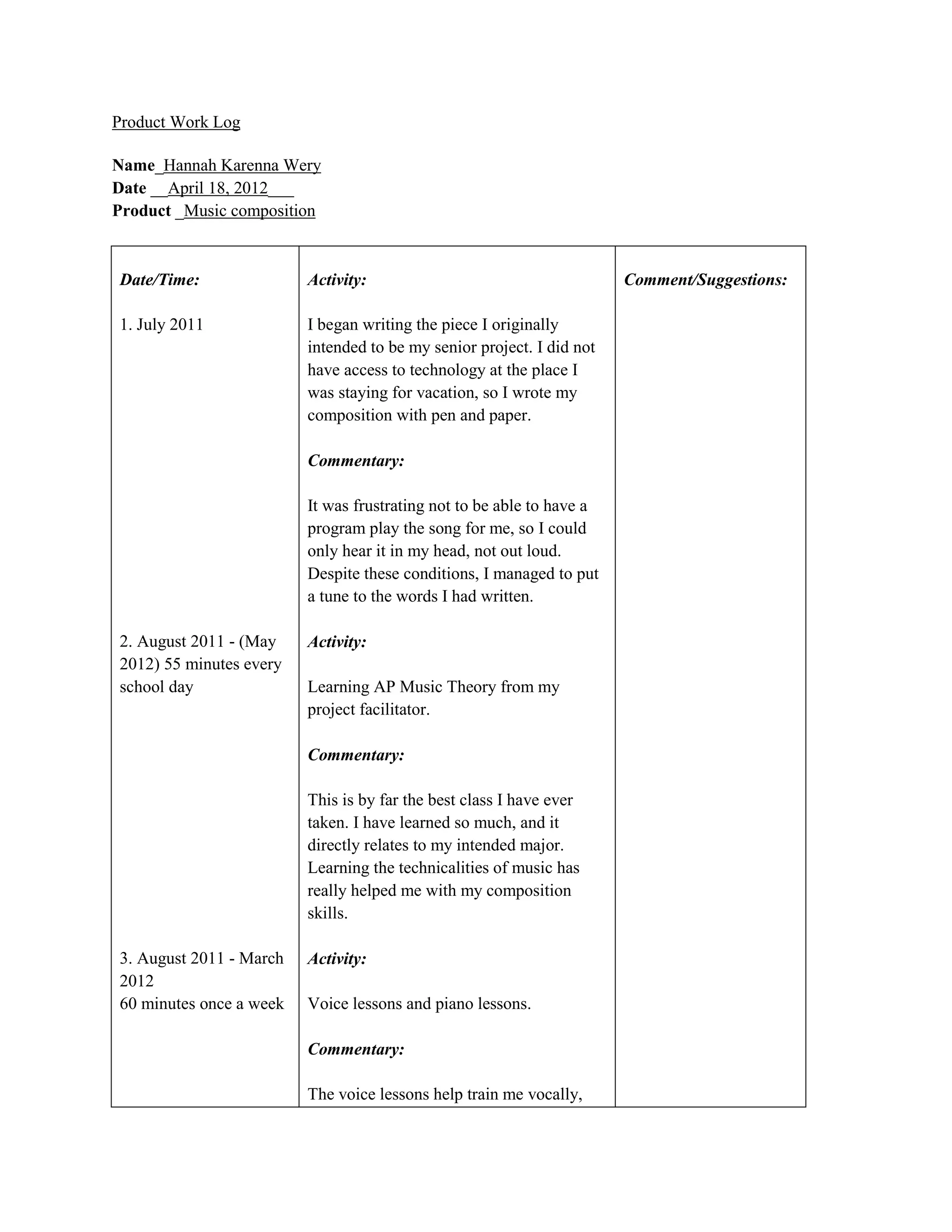 Hannah worked on a music composition project over several months, keeping a detailed log of her activities and progress. She wrote music, took lessons, taught a student named Caroline, and received feedback from her project facilitator. After many revisions, she completed her composition titled "A Rose Without Thorns" and recorded it to submit for her facilitator's final review.