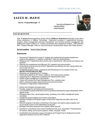 Saeed M. Marie is an experienced Senior Project Manager in IT with over 17 years in software and hardware across various sectors. His expertise includes project management, business analysis, and implementing IT strategies, with significant experience in ERP systems like Oracle and SAP. He has held key roles in managing government and private projects, focusing on IT department structuring, risk management, and achieving operational goals while ensuring service level agreements are met.