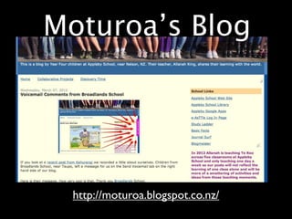 This document contains a list of links related to various subjects taught at Moturoa's Senior School. There are links for the school blog, writing, Google presentations, proofreading with an iPad, building confidence, a new teacher, reading books on an iPad, spelling practice, basic math facts, inquiry projects on rocky shores and helping children in Auckland, sharing ideas on Voicethread, and learning Māori greetings. The links provide online resources for students and teachers across different academic areas.