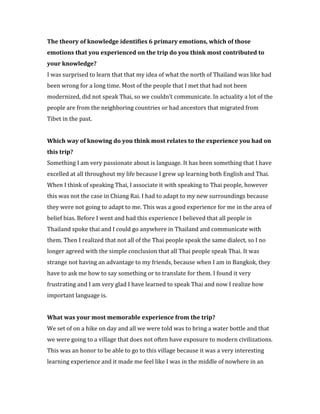 Curtis Palmer chose to do a community service trip to the Maekok River Village in Chiang Rai, Thailand for his senior seminar. He expected to have fun with friends but also learned about a different aspect of Thai culture. As someone raised in Thailand, he wanted to gain more knowledge of his home country and give back through community service. On the trip, he was surprised to find that not all people in the village spoke Thai and many had migrated from other countries. His most memorable experience was hiking to a remote village that had little exposure to modern civilization, where he had to rely on body language to communicate due to the language barrier.