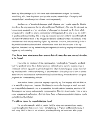 1) The document is a reflection by Anchalee June Bloxham, an 18-year-old senior at the International School of Bangkok, on her high school experiences with community service and sports and how they relate to her ways of knowing and understanding herself.