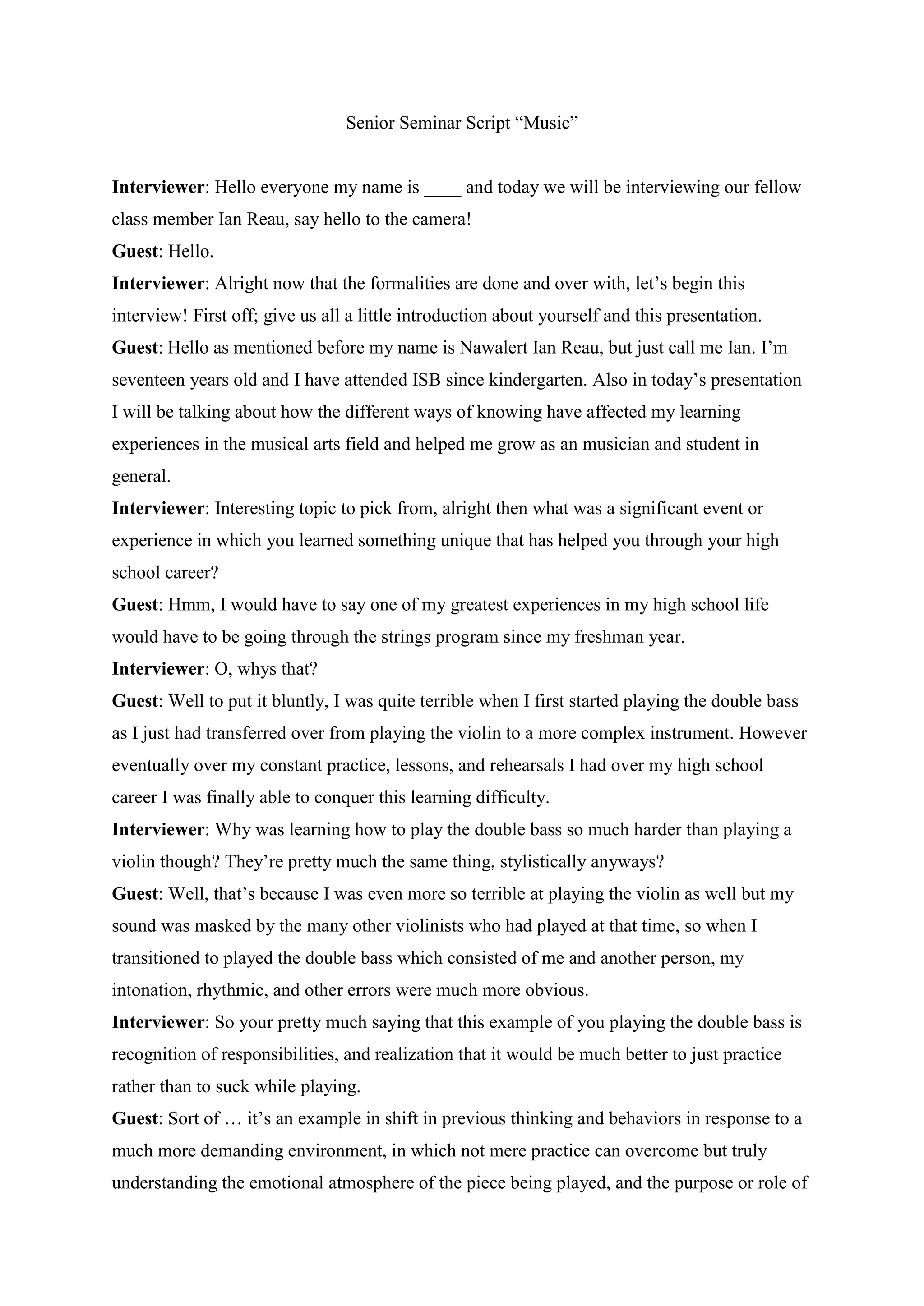 1) The guest discusses how playing the double bass helped him develop as a musician through overcoming difficulties with practice, lessons, and perseverance over his high school career.