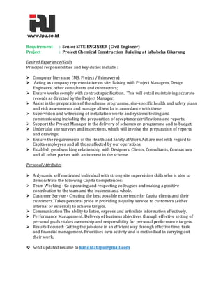 The document outlines the requirements for a Senior Site Engineer (Civil Engineer) for a chemical construction project in Jababeka Cikarang. Key responsibilities include site supervision, compliance with health and safety standards, and liaising with various stakeholders. The ideal candidate should possess teamwork, customer service, communication skills, and effective performance management, with an emphasis on achieving project targets.