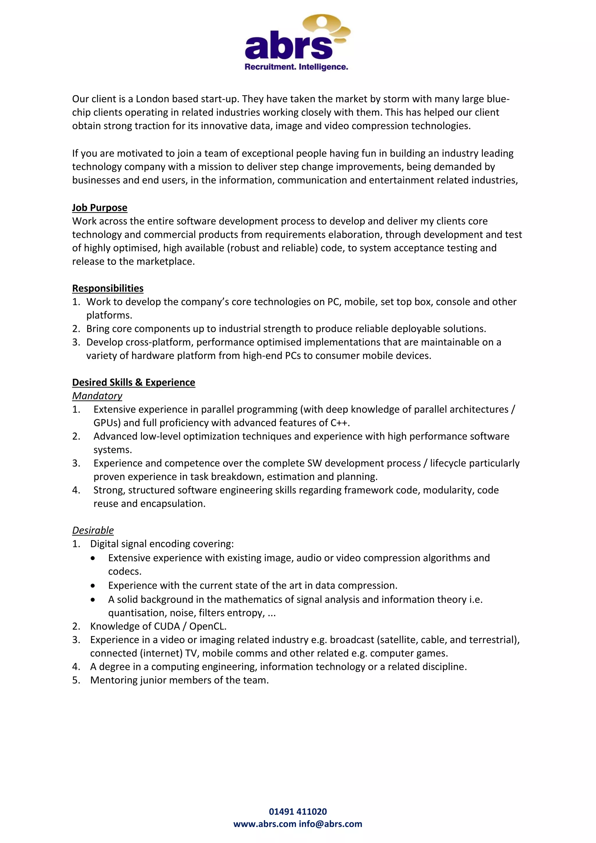 This London-based start-up has seen success with large clients in related industries and obtained strong traction for its innovative data, image, and video compression technologies. The company is seeking a software developer to work on its core technologies across platforms from development through testing and release. Responsibilities include developing the core technologies for various platforms, optimizing components, and creating cross-platform, high-performance solutions. Desired skills and experience include extensive experience in parallel programming, low-level optimization, software engineering processes, and signal encoding.