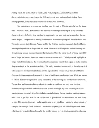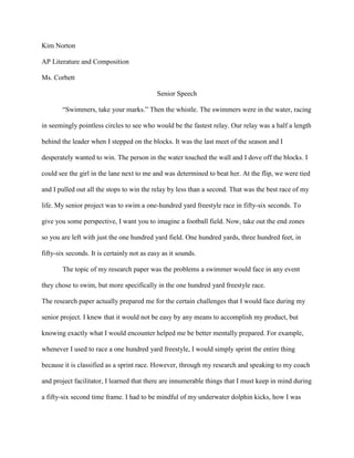Kim Norton wrote a senior speech about her senior project of swimming 100 yards freestyle in 56 seconds for her AP Literature and Composition class. She detailed her training process over the season, which included technique work, increased yardage and intensity during winter training, and challenges like injuries and nutrition. Through focused training with her coach Landon Harris, she was able to drop her time from 57.07 to achieve her goal. She learned the importance of mental toughness and pushing through pain to accomplish goals.