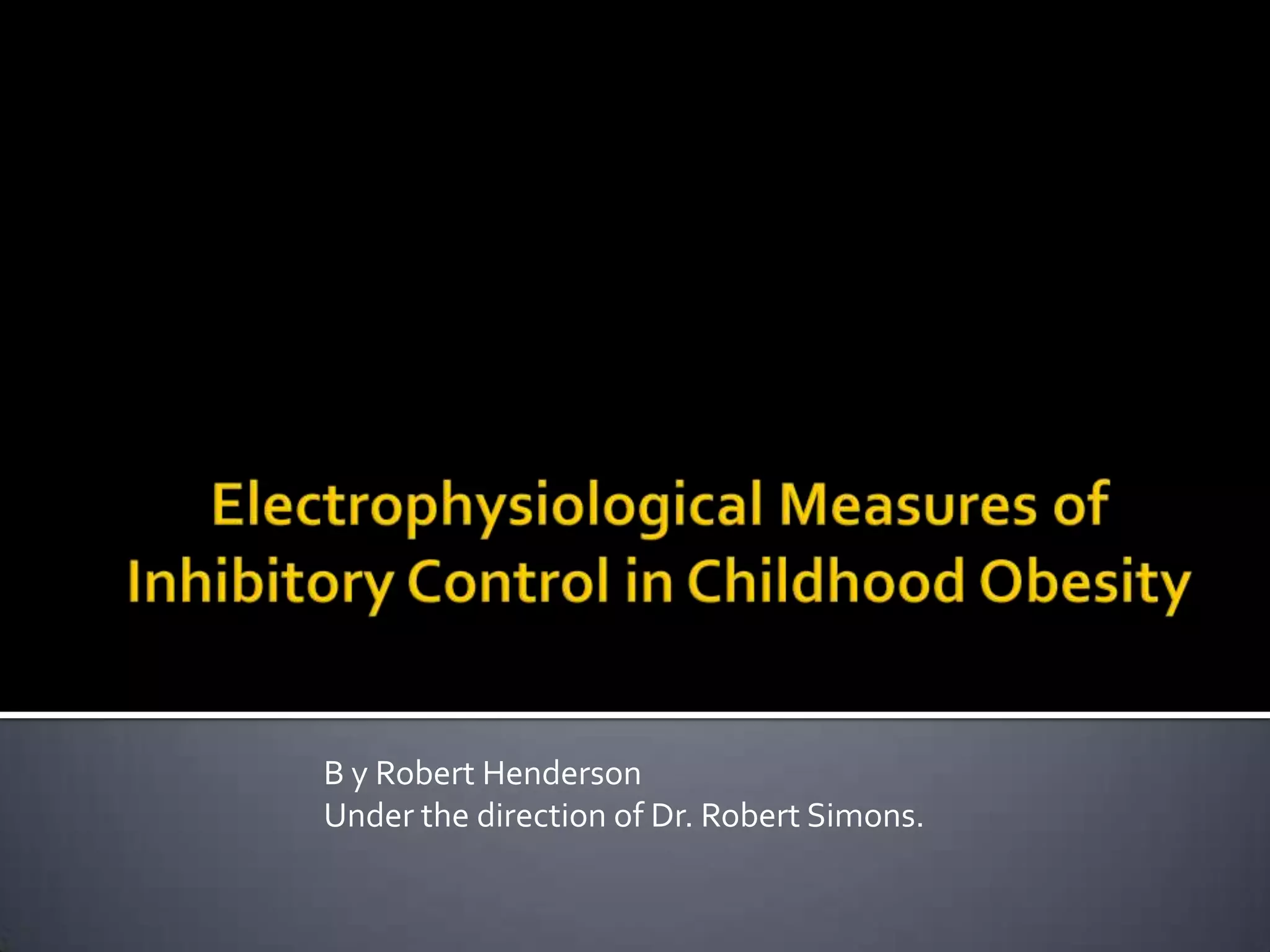 This document summarizes research investigating potential differences in inhibitory control between overweight children and normal-weight controls using electrophysiological measures. The study used a stop-signal reaction time task to measure inhibitory control and analyzed event-related potentials (ERPs), specifically the N2 and P3 components. Behavioral results found no significant differences in stop-signal reaction times between groups. ERP results found no significant group differences in the amplitude of the N2 or P3 components. However, the P3 component occurred earlier for successful stop trials compared to unsuccessful stop trials overall. The study had limitations due to small sample sizes and discusses avenues for future research.
