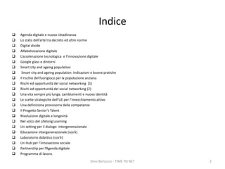 Il documento discute dell'importanza della cittadinanza digitale per promuovere il protagonismo sociale delle diverse generazioni, evidenziando il digital divide e la necessità di alfabetizzazione digitale, in particolare per la popolazione anziana. Viene presentato il progetto 'senior’s talent' come iniziativa strategica per favorire l'inclusione degli anziani attraverso l'uso delle tecnologie digitali. Si sottolineano rischi e opportunità legate al social networking e alle smart cities nel contesto dell'invecchiamento attivo e delle politiche europee.