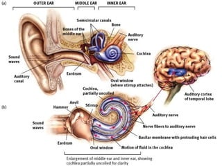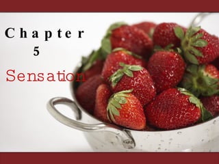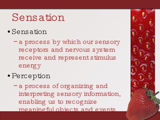 Sensation is the process by which our sensory receptors and nervous system receive and represent stimulus energy from our environment. Perception involves organizing and interpreting sensory information to recognize meaningful objects and events. Psychophysics studies the relationship between physical stimulus characteristics and our psychological experience of them. Thresholds refer to the minimum levels of stimulation needed for detection, and signal detection theory examines how we detect faint stimuli.
