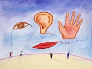Sensation is the awareness or mental process that arises from stimulation of the senses. There are three conditions for acquiring sensory awareness: 1) stimulation of a sense organ by physical or chemical energy, 2) the presence of receptor cells in a sense organ, and 3) stimulation of the receptor cells by a stimulus. The stimulus is converted into electrochemical impulses via transduction and transmitted to the brain via nerves. The two main types of senses are distal senses, which detect stimuli from a distance like vision and audition, and proximal senses, which require direct contact like smell, taste, and touch.