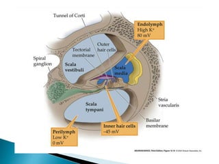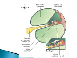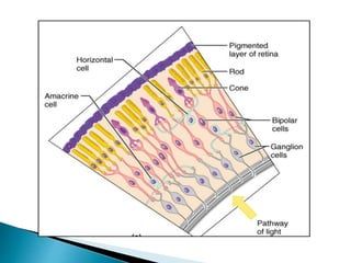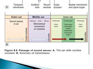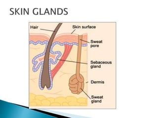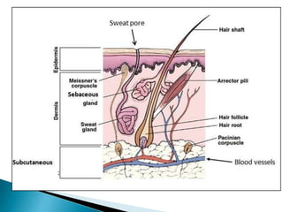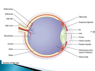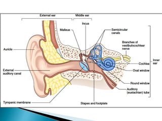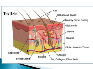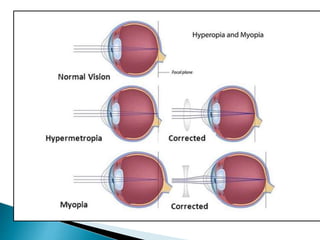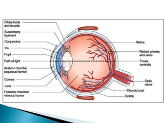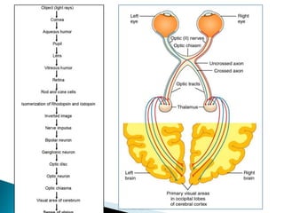 The document provides a detailed overview of the anatomy and physiology of the eye, ear, and skin, highlighting the functions and structures involved in vision and hearing. It describes the layers of the eyeball, the roles of tears, the mechanisms of light refraction, and common eye disorders like myopia and hypermetropia, as well as components of the ear responsible for hearing. Additionally, it outlines the layers of the skin, emphasizing the importance of keratin and melanin produced by the epidermis and dermis.