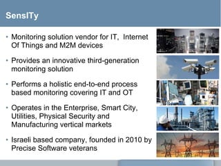 Senseity provides a third-generation business process monitoring solution that takes a holistic, end-to-end approach to monitoring IT and operational technology systems. It maps critical business processes to their underlying IT components like servers, applications, sensors and networks to identify issues before they impact operations. The solution discovers infrastructure automatically, establishes performance baselines, and uses big data analytics to proactively identify deviations and drill down to the root cause of problems. It aims to optimize processes, improve uptime and reduce costs for enterprises across industries.