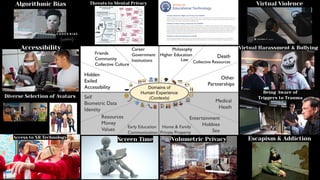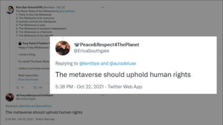 The document discusses ethical frameworks for the metaverse, highlighting Parisi's seven rules that define its characteristics, such as being inclusive and open. It also emphasizes the importance of mental privacy rights and neuro-rights in the context of XR technologies, arguing that biometric data is often inadequately protected by current laws. The text calls for ethical design principles and the need for new privacy regulations that address the complexities of user data in XR environments.