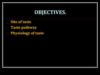 This document discusses the physiology of taste. It begins by defining taste as a chemical sense stimulated by food and drink, noting taste buds are located on the tongue, palate, and other areas. It describes the four main types of papillae on the tongue containing taste buds and lists the five basic taste sensations. The document outlines the pathway from taste bud receptors through cranial nerves to the brain regions involved in taste perception. It discusses factors influencing taste sensitivity and abnormalities of taste sensation.