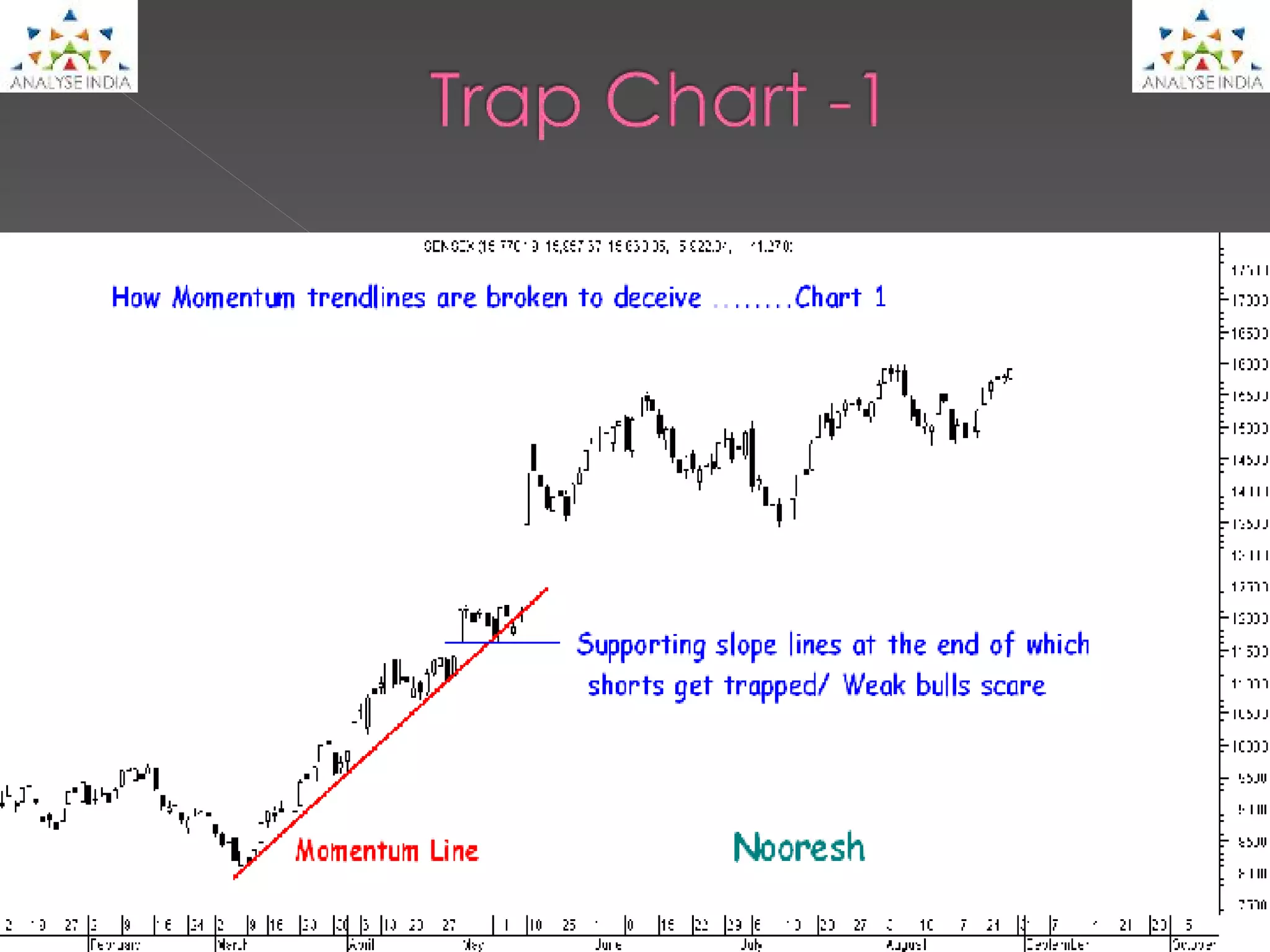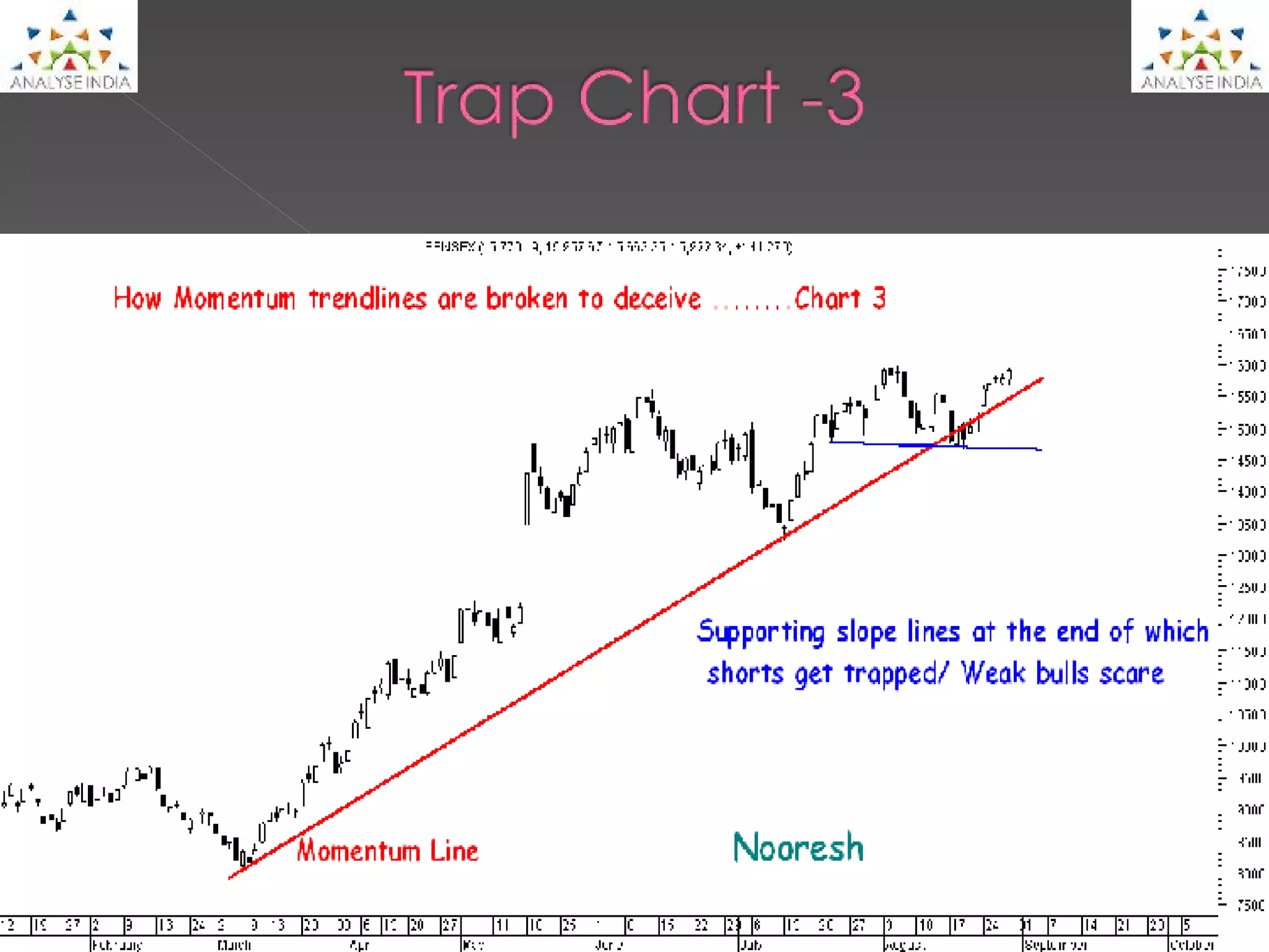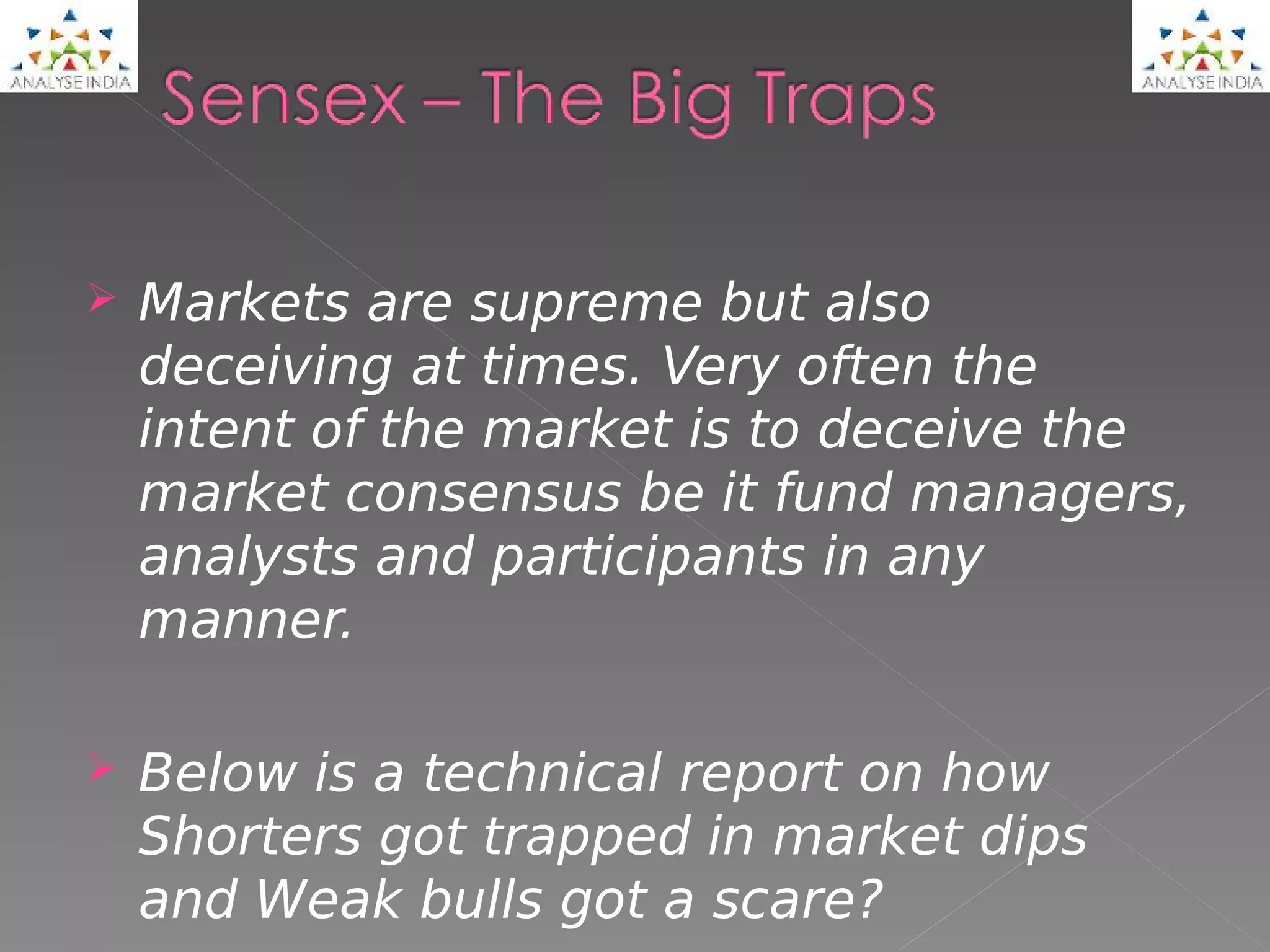 The document discusses how short sellers got trapped in market dips and weak bulls got scared. It analyzes technical trends and support lines, noting how the trendline was broken slightly but the sloping support line held. This trapped short sellers and scared weak bulls. After effects included a large gap up move of over 20% and stocks exploding past resistance levels with accumulation. The document concludes by saying to watch the market closely as it approaches 16200-16800 levels for signs of a large correction.