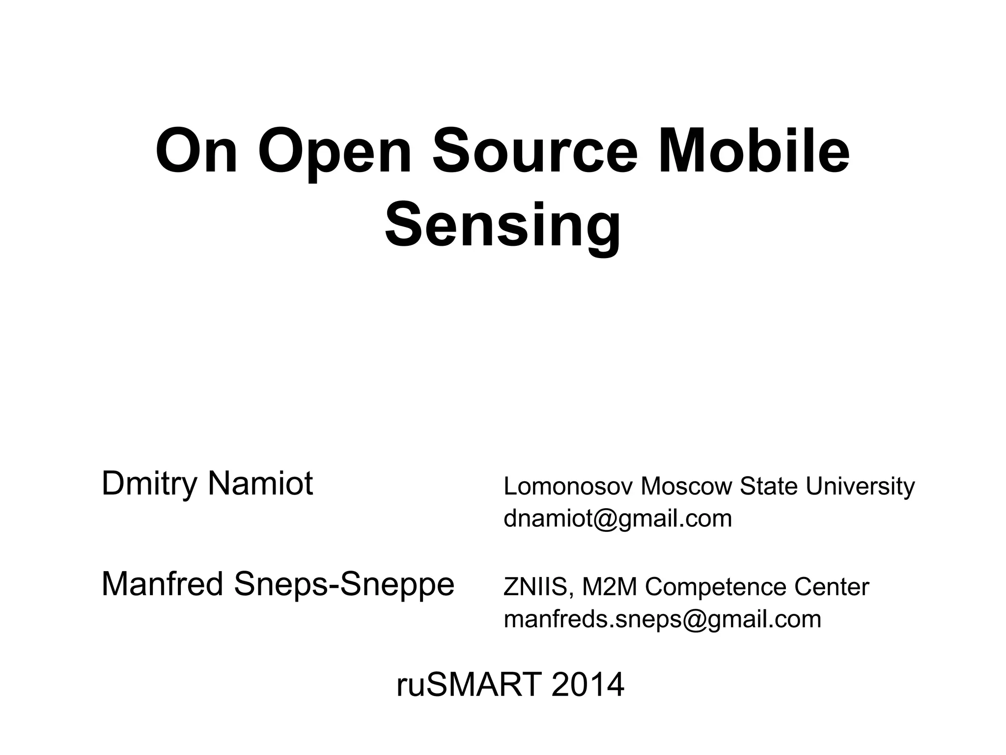 This document discusses open source mobile sensing. It provides an overview of existing open source libraries for mobile sensing and categorizes them. It also examines challenges in mobile sensing, such as battery life and data collection procedures. The goal is to describe current architectures and designs and identify future directions for open source mobile sensing frameworks.